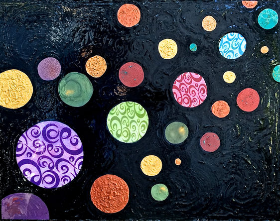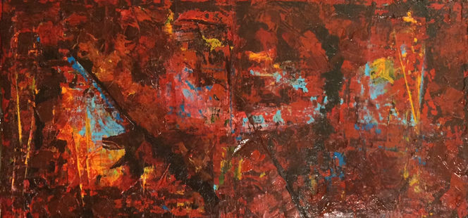 Contrasts are key--through color, textured surfaces, and the addition of other media to the canvas. The majority of pieces are resined to enhance contrast, brilliance, and color.